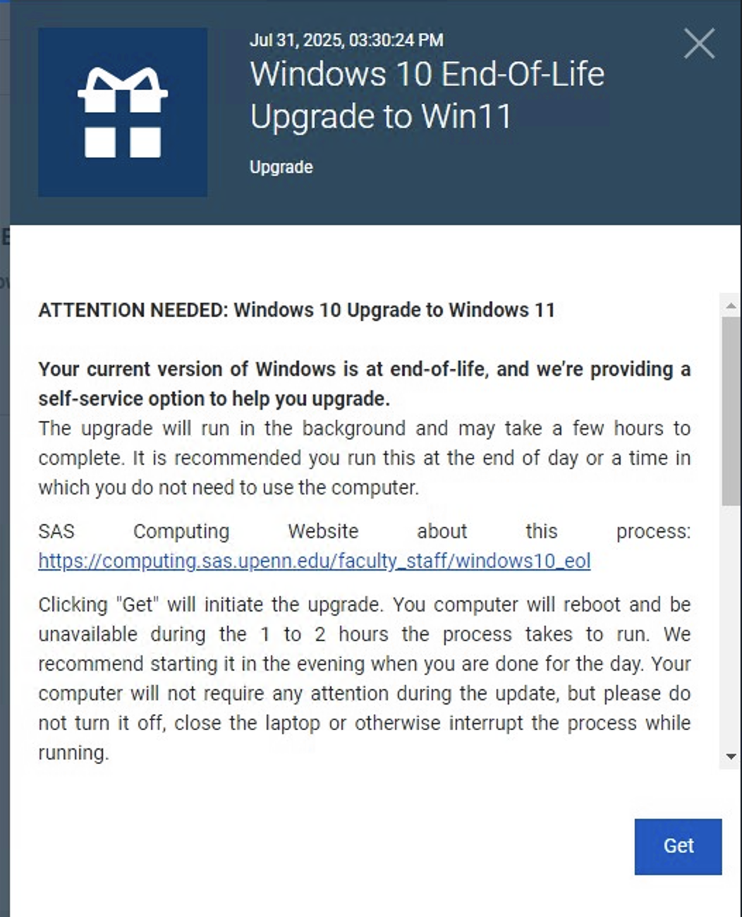 Due to Penn's new security policy on patching, any Windows computers not migrated to Windows 11 by 10/14/2025 will be subject to disconnection from Penn’s network. This applies to any computer running an end-of-life (EOL) operating system. Exceptions will be extremely rare, and any review and remediation must be fully completed before Windows 10 is no longer supported.