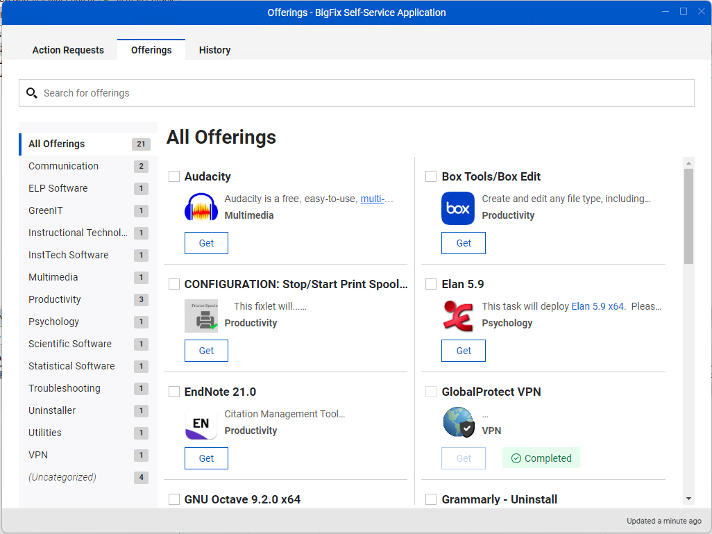 1. You should see a b  icon running in the taskbar at all times, click this to open the BigFix Self-Service Application (SSA)